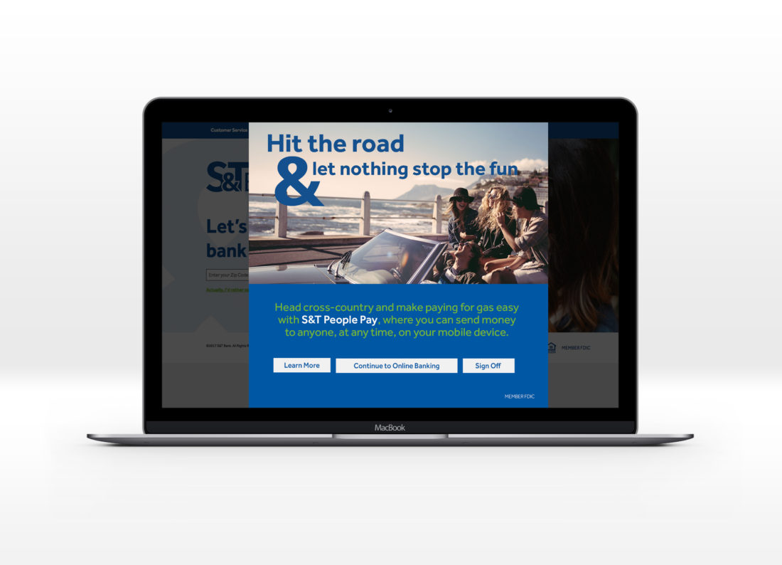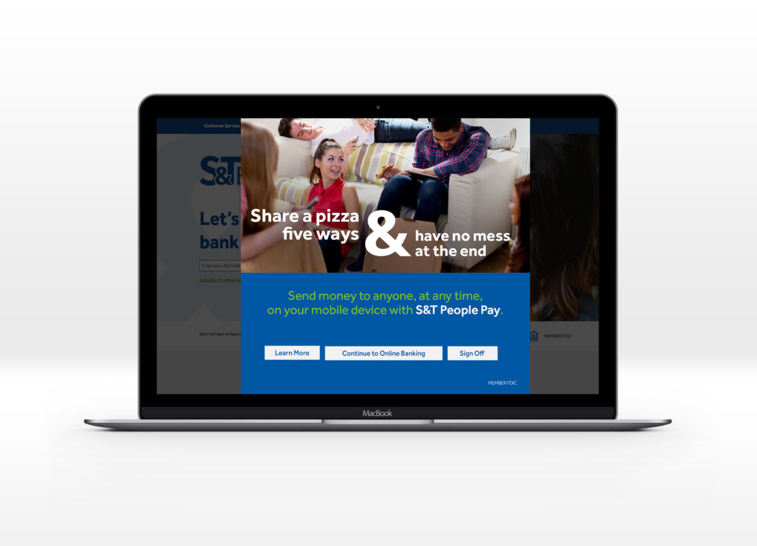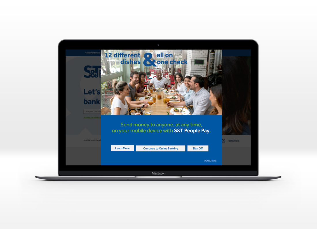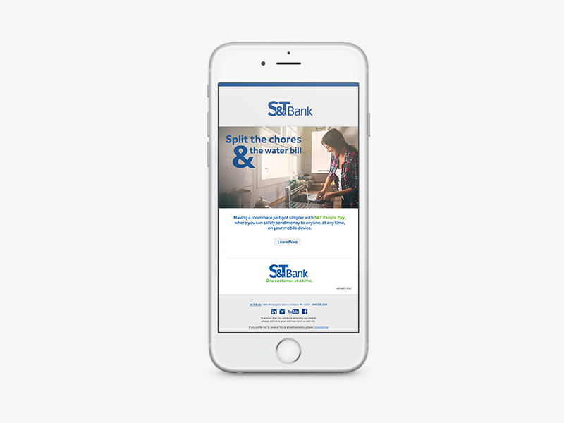 A financial institution set out to position its People Pay service as a competitive alternative to existing peer-to-peer payment platforms. With a target demographic of 18–35, the campaign concepts were developed to resonate with a broad spectrum of millennial users. Nine creative directions were presented, with the initial expectation that three would move forward. However, S&T Bank ultimately approved and launched all nine concepts.